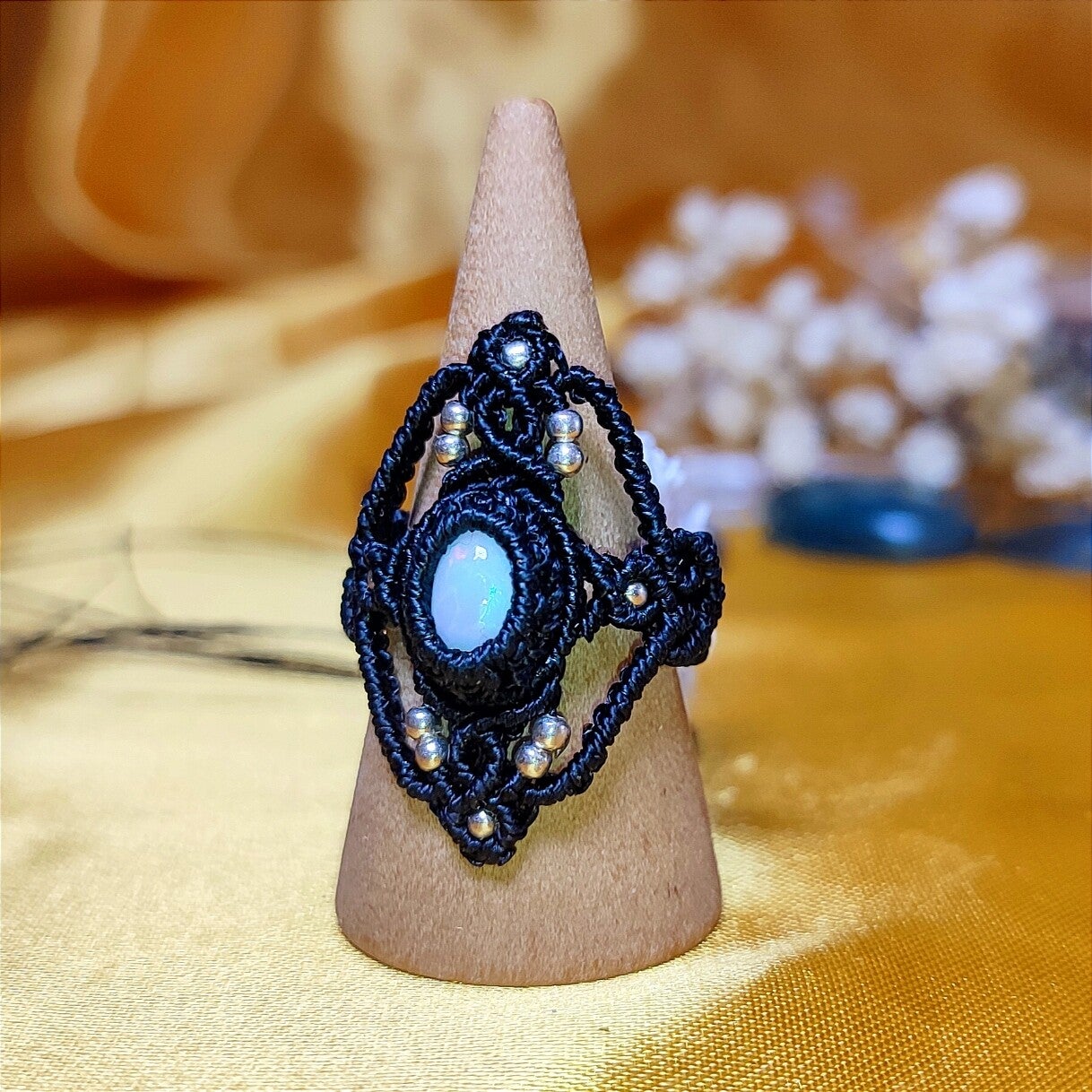 Anillo micro macramé con Ópalo de fuego etíope (negro)