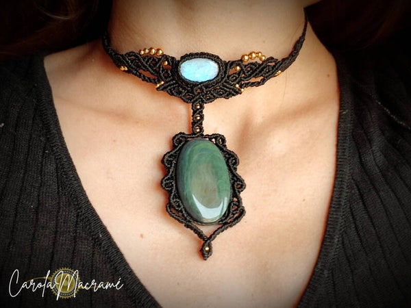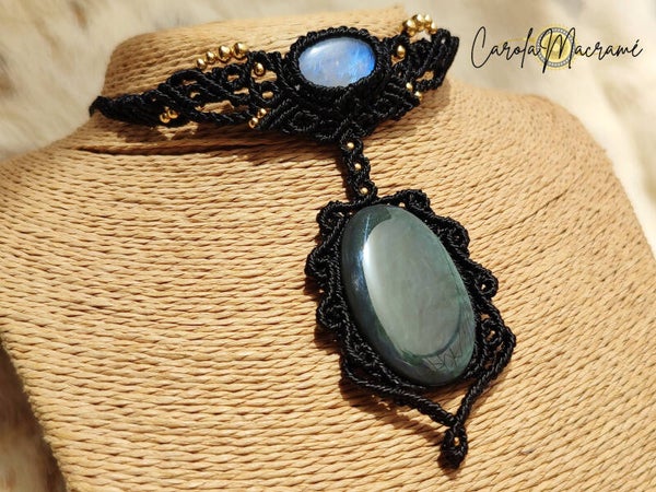 Collar gargantilla ''Ysera'' con Piedra Luna y Obsidiana Huichol