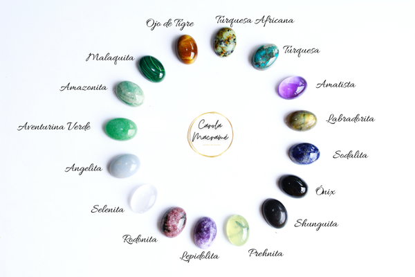 Minerales disponibles: Shunguita, Labradorita, Turquesa, Amazonita, Aventurina Verde, Sodalita, Ojo de Tigre, Malaquita, Turquesa Africana, Amatista, Prehnita, Rodonita, Selenita, Lepidolita, Ónix y Angelita