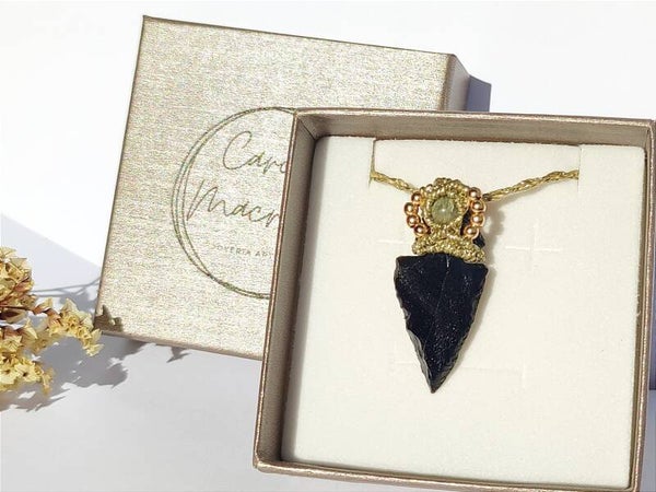 Collar flecha de Obsidiana negra con Turmalina Verde. Dorado