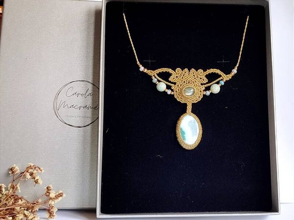 Collar o gargantilla ''Andrómeda'' con Larimar, Labradorita y Amazonitas. Dorado