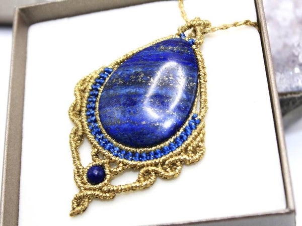 Colgante macramé con Lapislázuli. Dorado y azul marino.