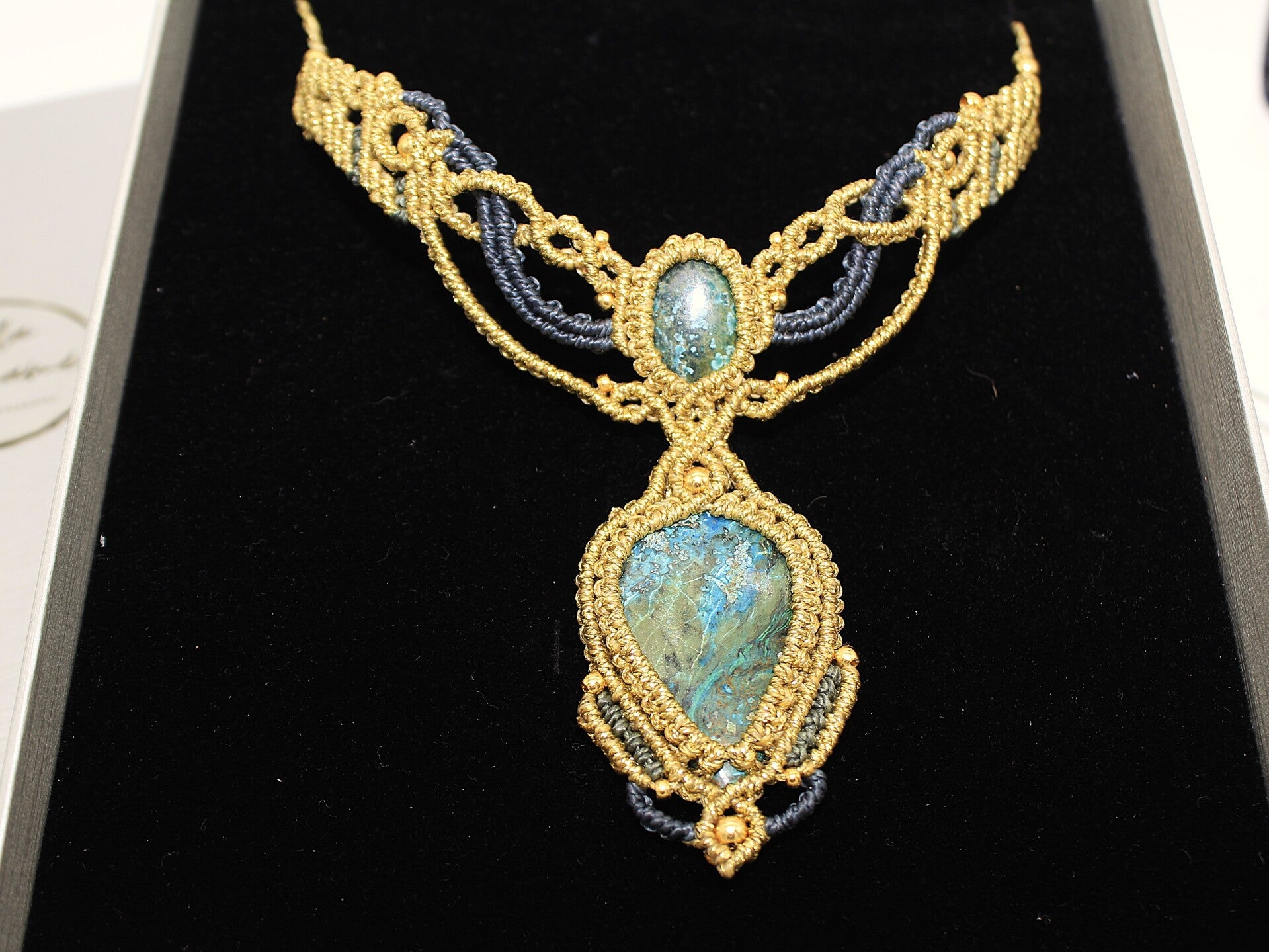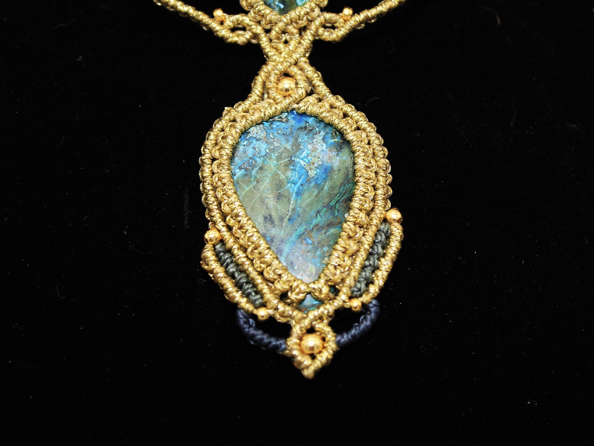 Collar único con Shattuckita y Turquesa. Dorado, azul y verde.