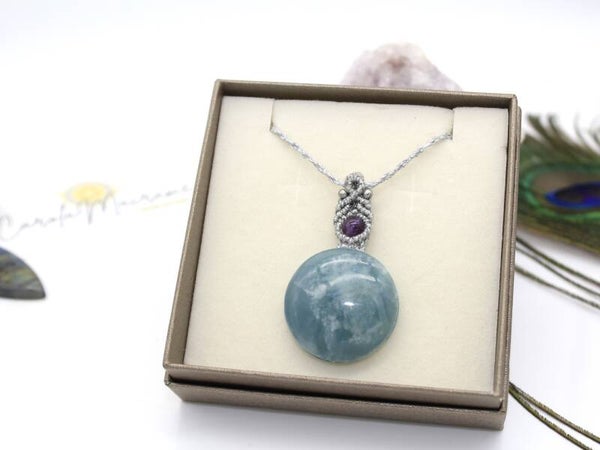 Colgante de macramé con Ónix Cielo y bolita de Amatista. Plateado.