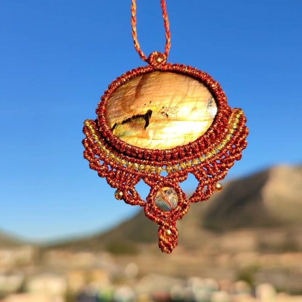 Colgante único con Espectrolita naranja y bolita de Citrino. Color cobre.