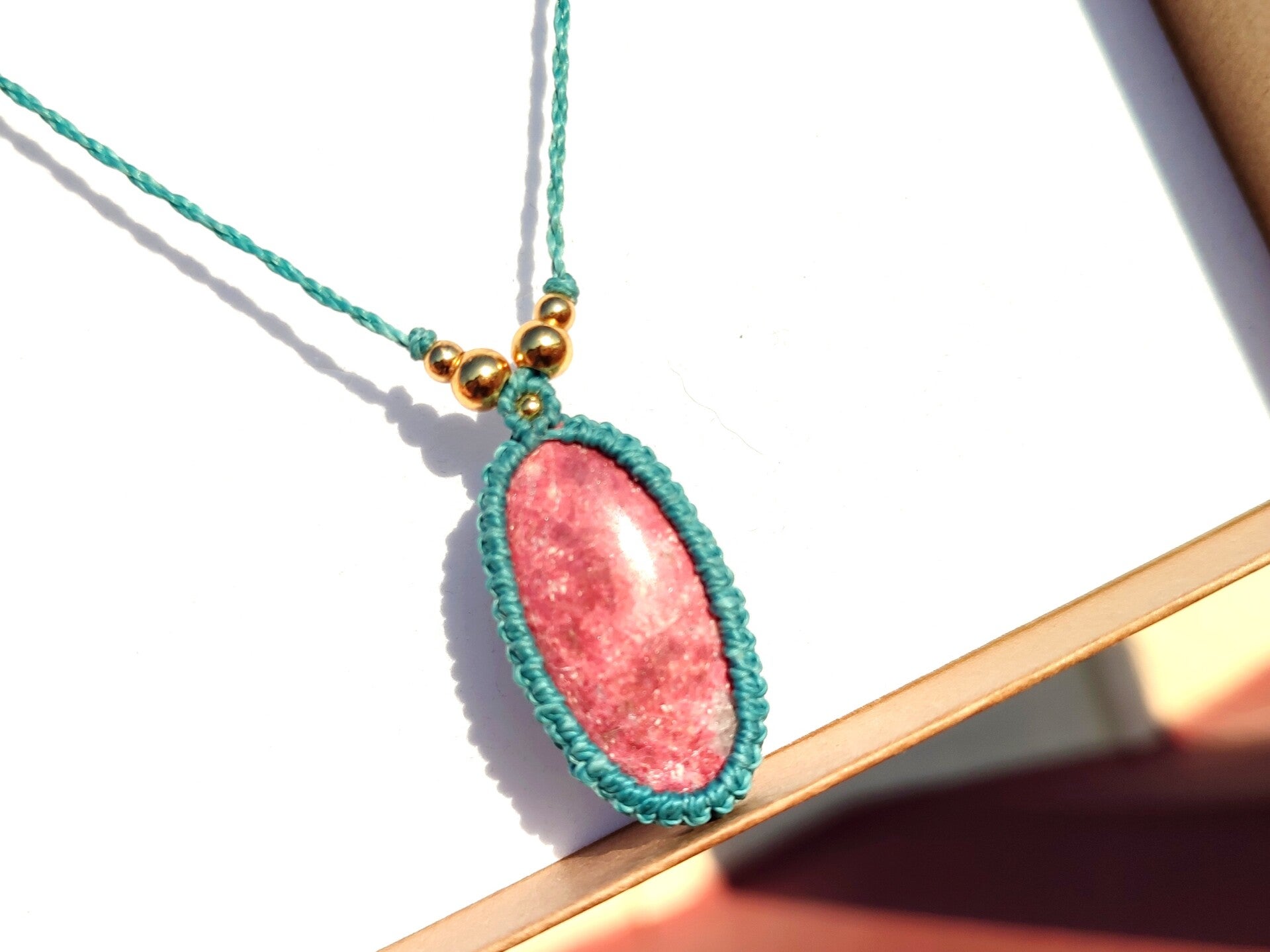 Tejido en hilo de 1mm de grosor. Es solo una pieza. El cordón del colgante de Thulita no es ajustable, la gargantilla si. Las flores son en acero inoxidable pintadas con resina.