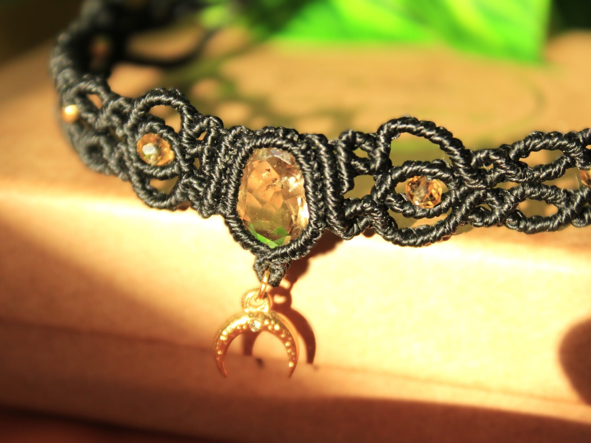 Tejido en hilo de 1mm de grosor. Cristales facetados. Luna de acero con circón.