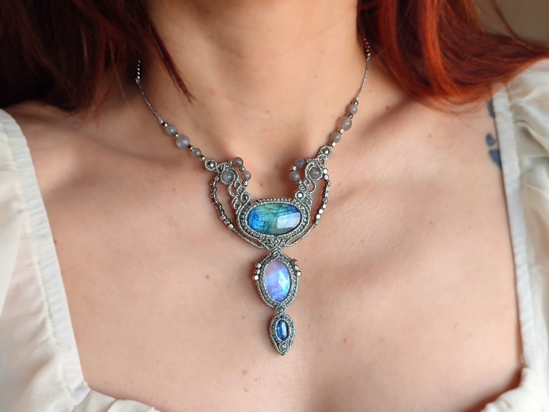 Collar único con Labradorita, Piedra Luna facetada y Cianita. Plateado.