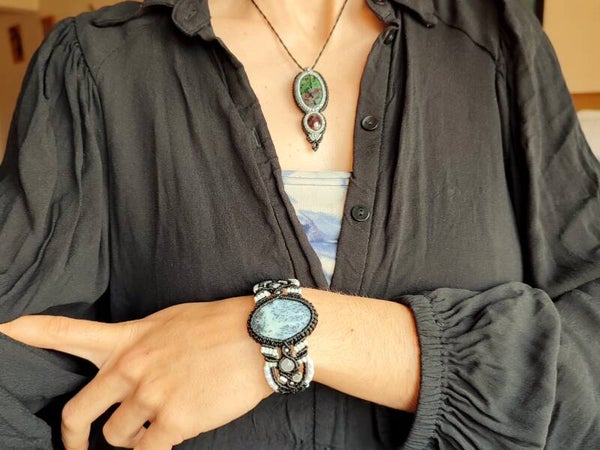 Tejido en hilo de 1mm y 0'5mm de grosor. Tamaño colgante 6'5x2'5cm