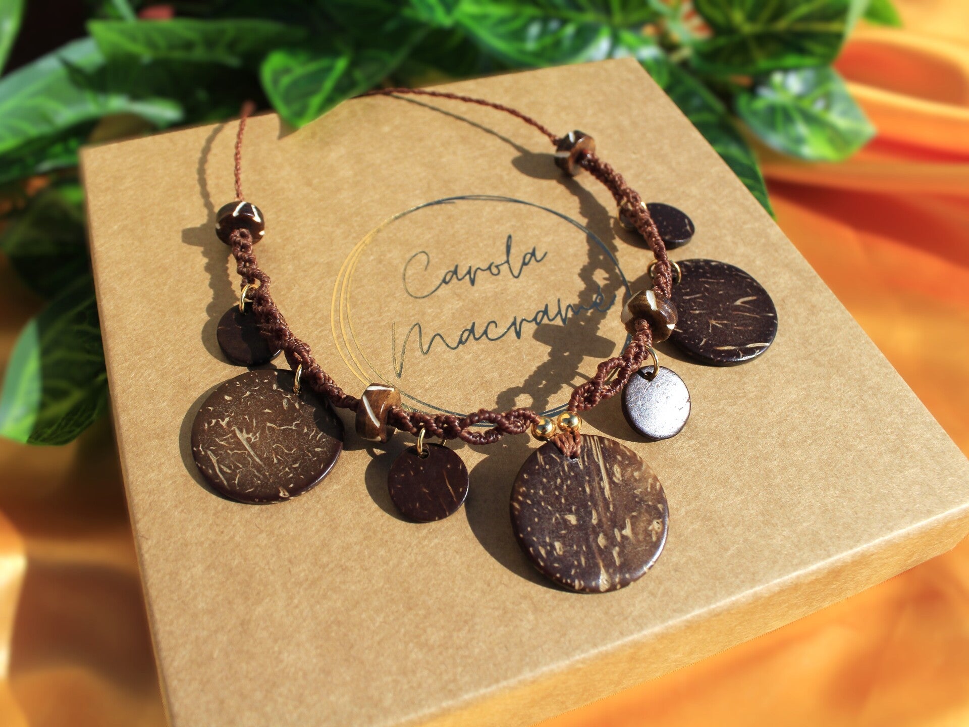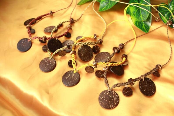 Tejida en hilo de 1mm. Coco y cuentas de hueso tallado.
