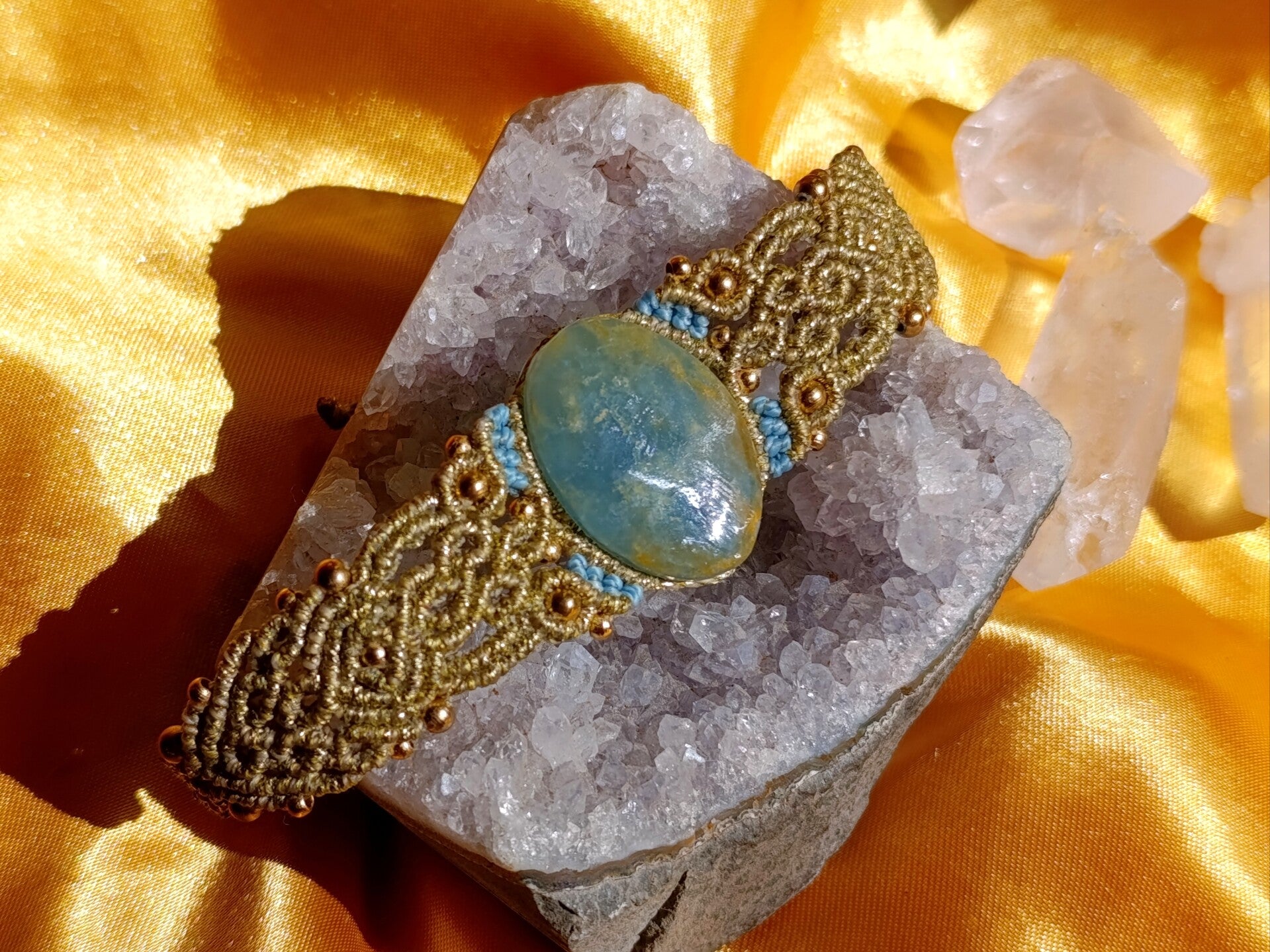 Pulsera brazalete con Ónix Cielo. Dorada y azul cielo.
