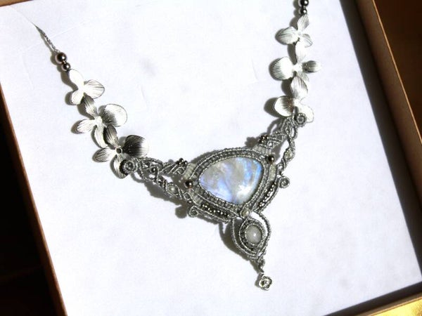 Collar único ''Filia Lunae'' con Piedra Luna, Zafiro Star blanco y Perlas de agua dulce.