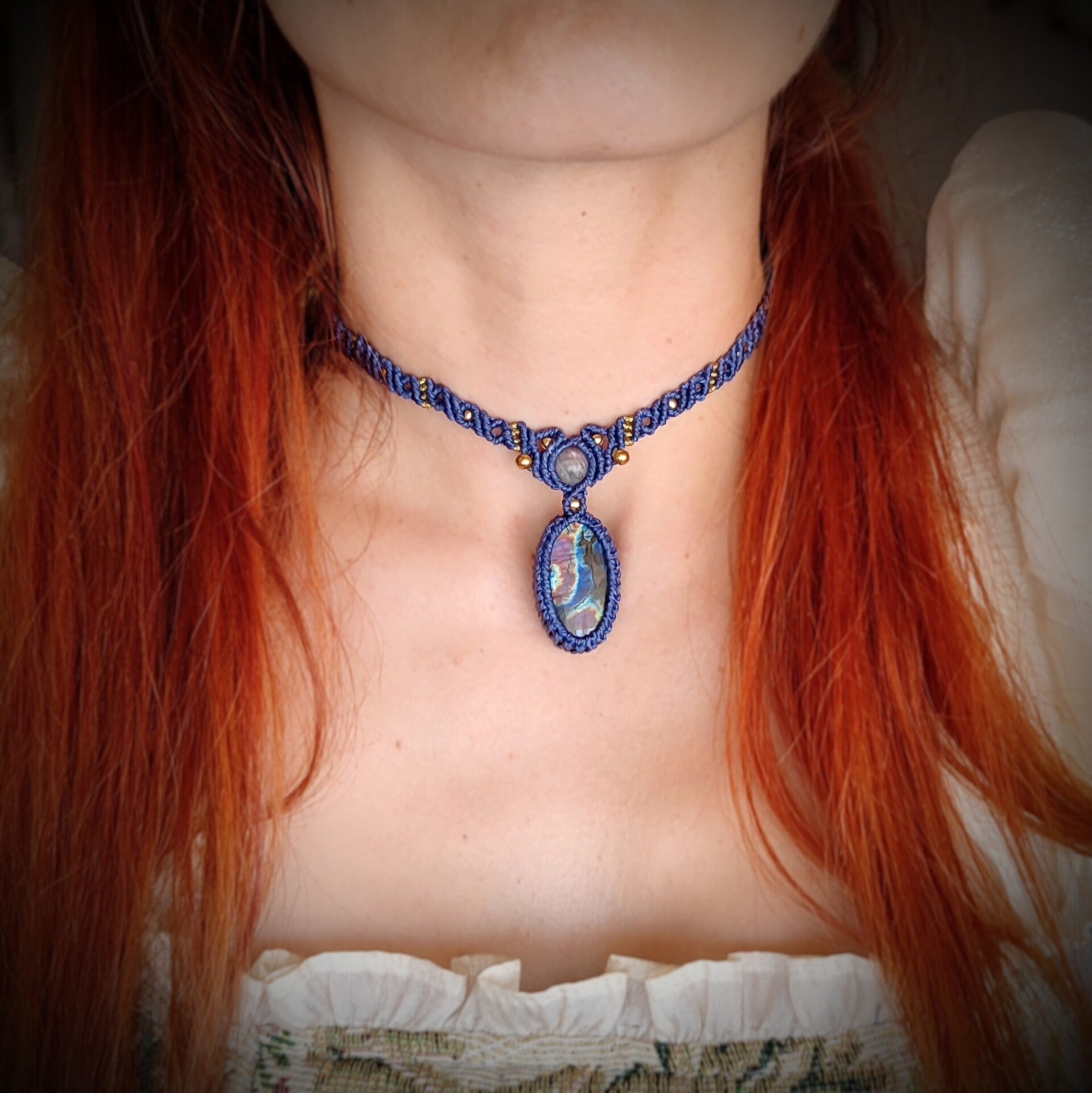 Gargantilla con Espectrolita. Azul marino y dorado.