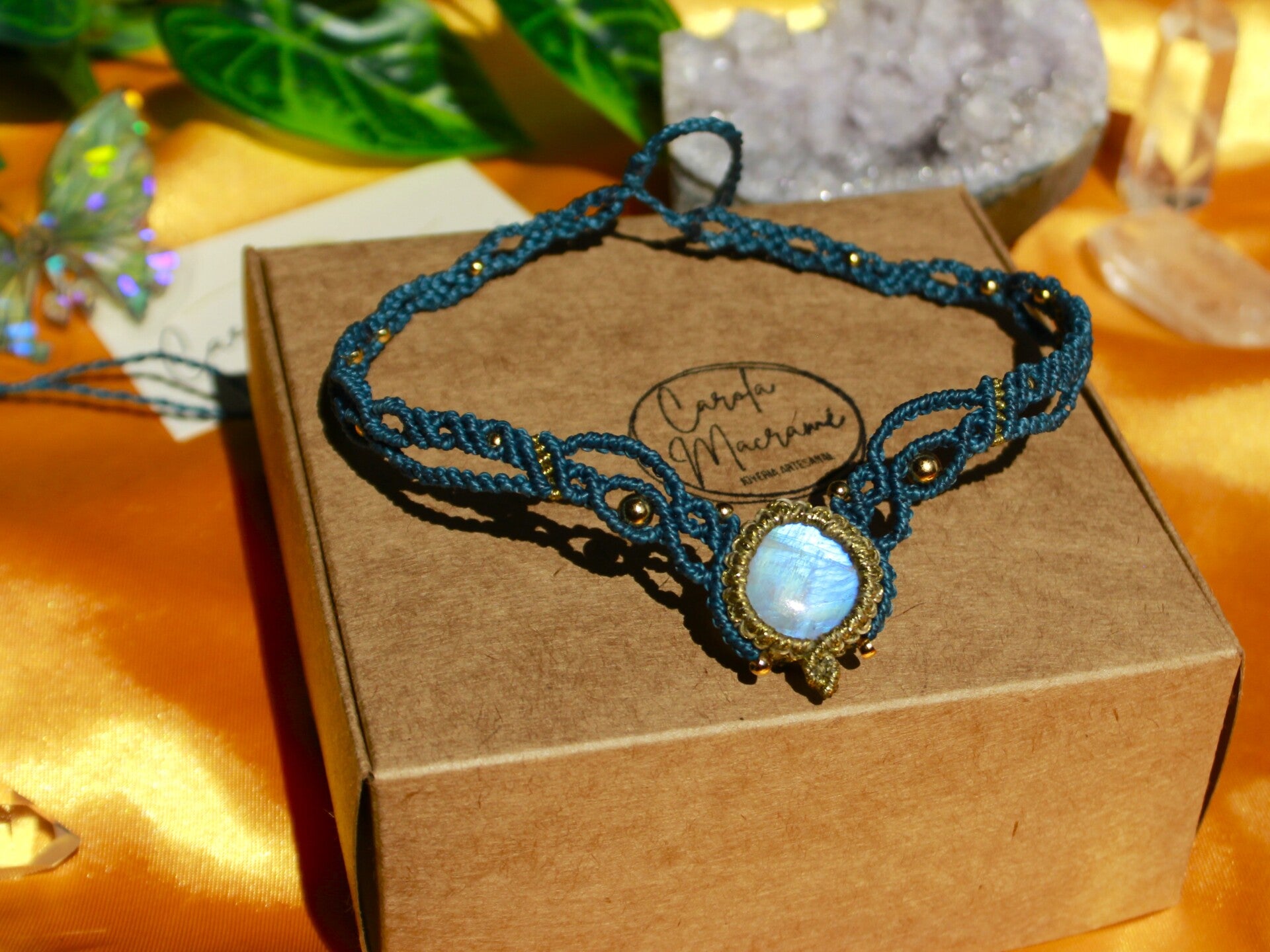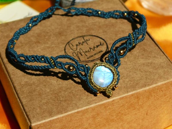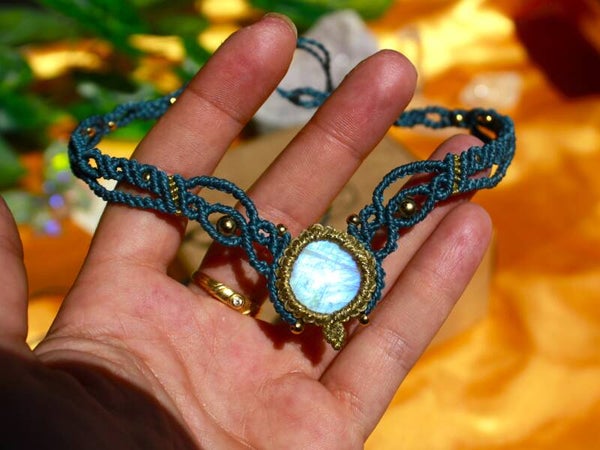 Gargantilla o tiara con Piedra Luna. Turquesa y dorada.