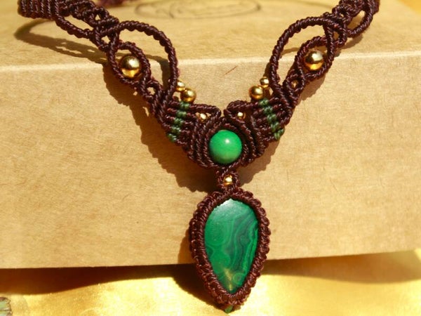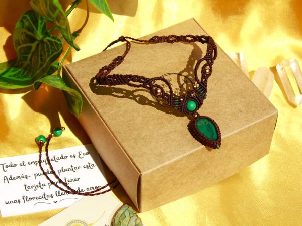 Gargantilla o collar con Malaquita. Marrón chocolate y verde.