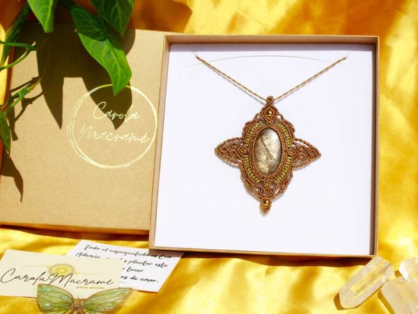 Tejido en hilo de 1mm. Tamaño colgante 9x8cm. Modelo de edición limitada, único e irrepetible.