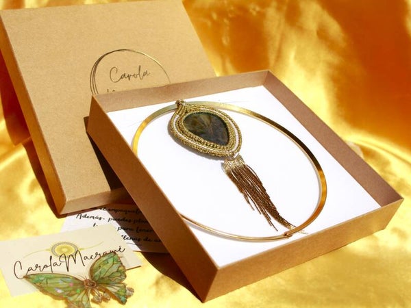 Collar de macrame con torque y flecos de acero inoxidable como el modelo lucido por Laura Madrueño en Supervivientes 2024 y 2025, en esta ocasión con Labradorita, color dorado y detalle en turquesa.
