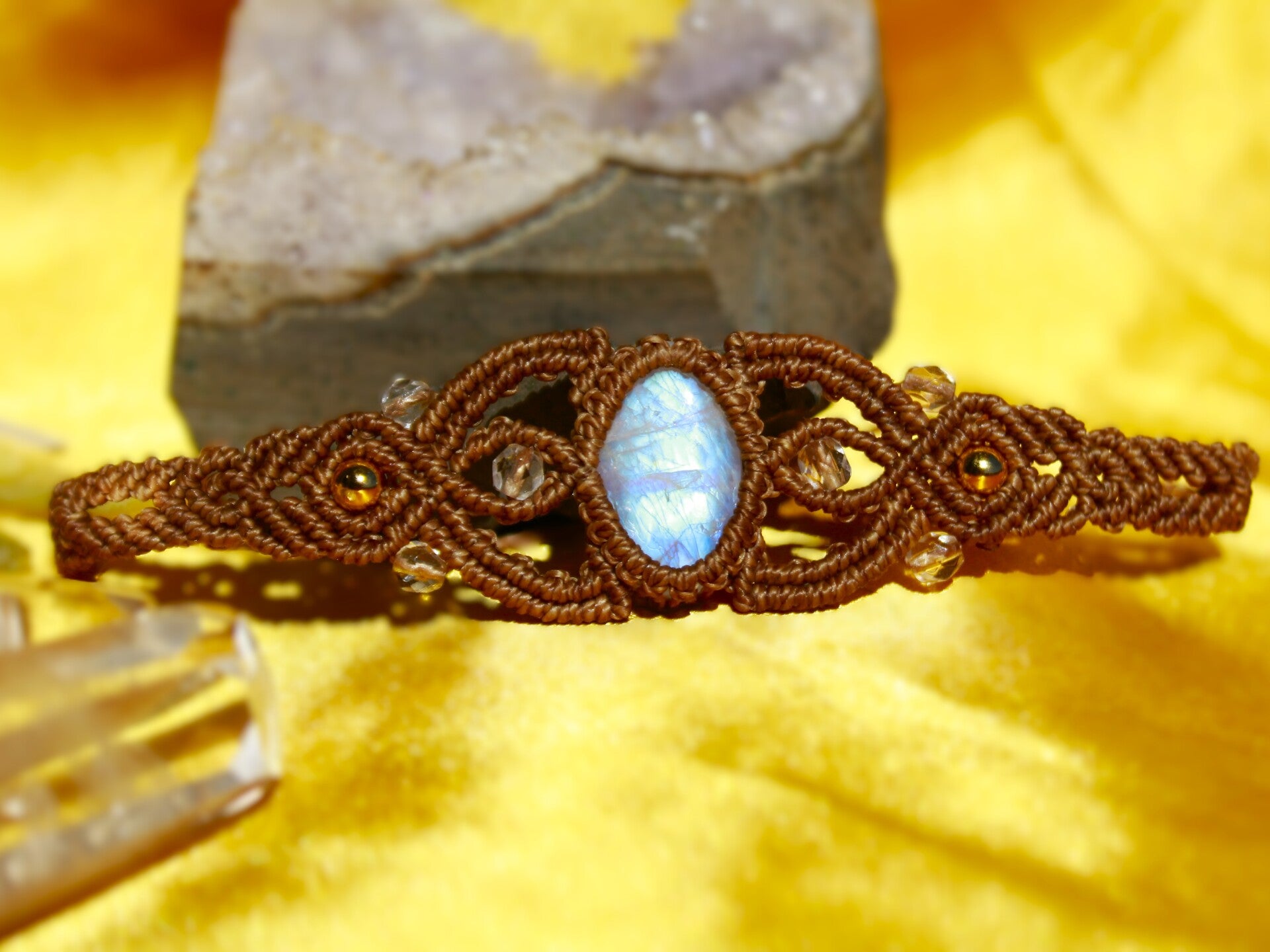 Pulsera brazalete con Piedra Luna y cristales facetados de Bohemia. Marrón.