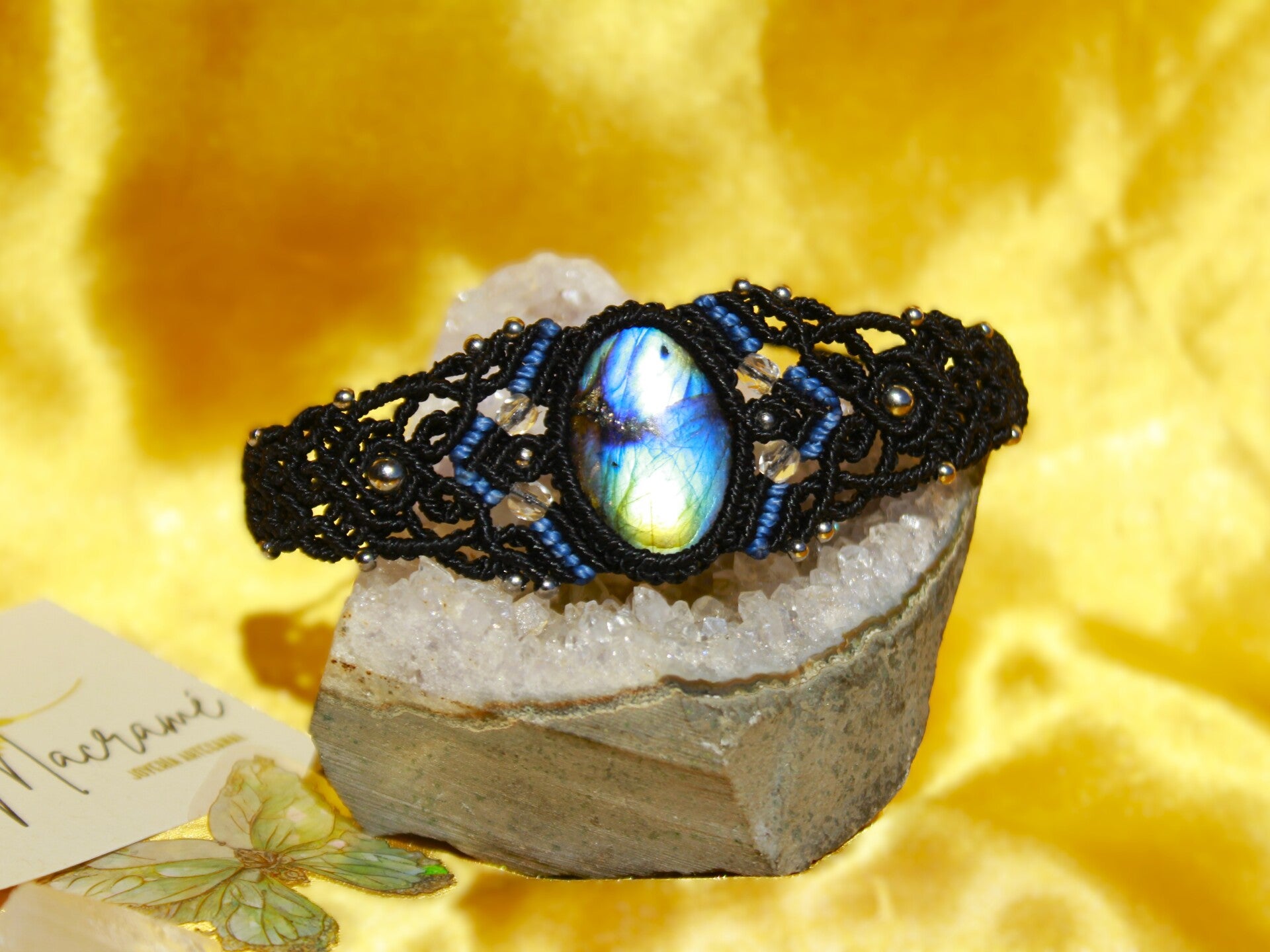 Pulsera brazalete con Labradorita y cristales facetados de Bohemia. Negra y azul.