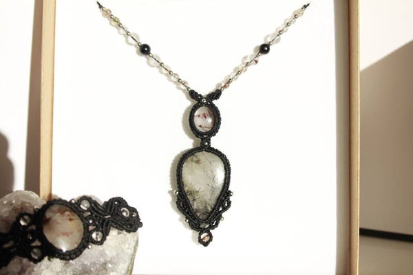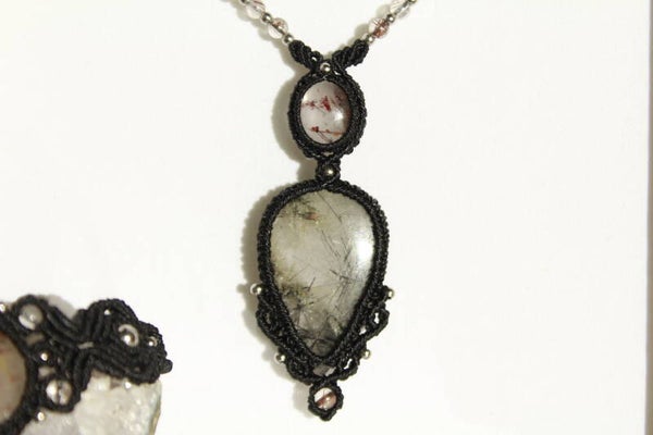 Tejido en hilo de 1mm de grosor. Es el modelo Shambala, pero se vuelve un collar único e irrepetible de la edición limitada Portal 11 por la rareza de las gemas que he utilizado.