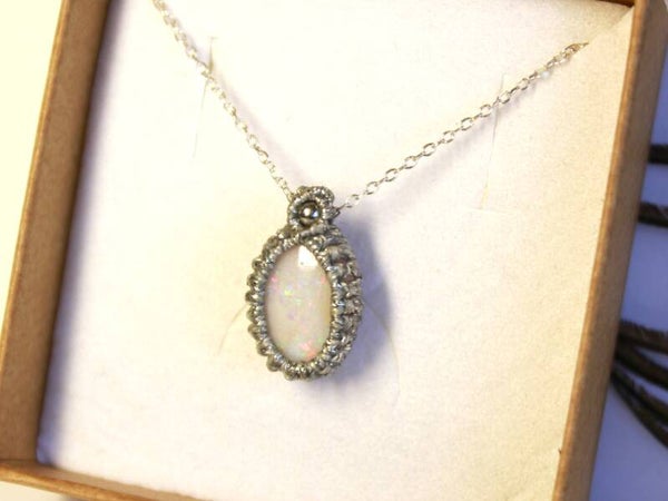 Tejido en hilo de 0'5mm de grosor. Tamaño colgante 3x2'6cm.