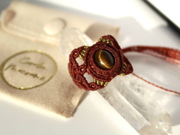 Anillo micro macramé con Ojo de Tigre. Marrón y Dorado.