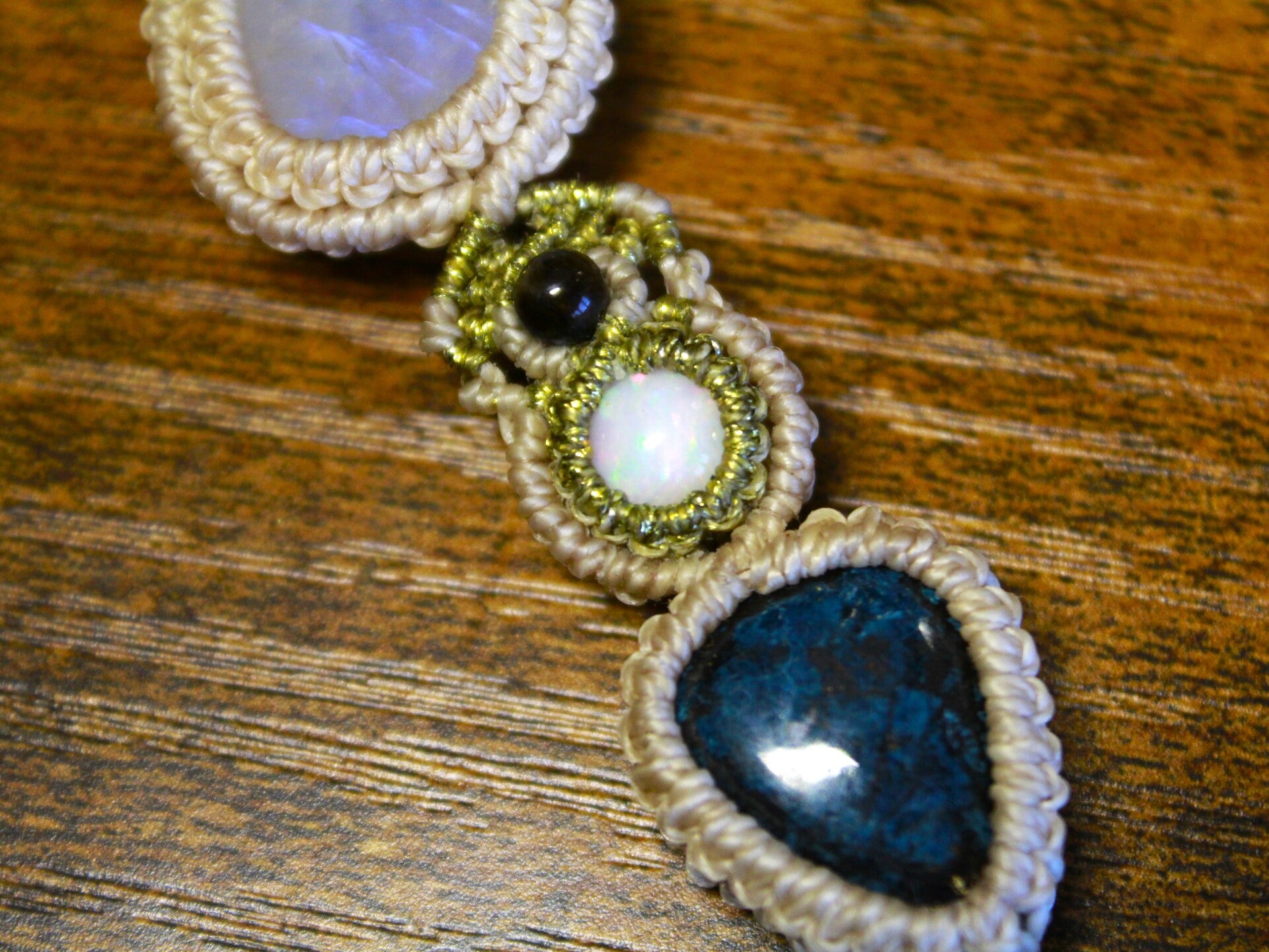 Colgante triple con Piedra Luna, Ópalo de fuego y Azurita.