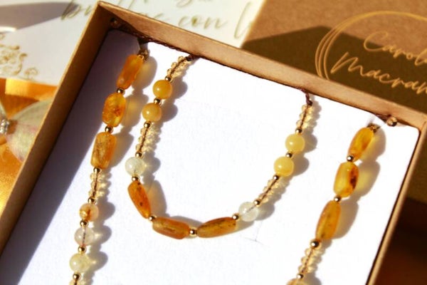 El ámbar limpia lo que pesa, el citrino atrae oportunidades y el jade amarillo sostiene la claridad para que puedas reconocerlas y caminar hacia ellas con confianza. Llevar este collar es invitar a la vida a fluir a tu favor, cultivar la alegría consciente y avanzar guiada por tu propia luz interior. Un ritual para quienes están listas para comenzar un nuevo ciclo irradiando fuerza suave, abundancia y propósito.