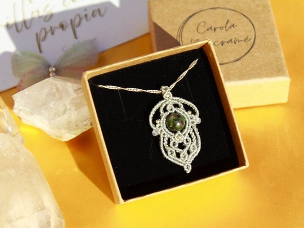Colgante con Turmalina Verde y Rosa. Micro macramé con Plata de Ley