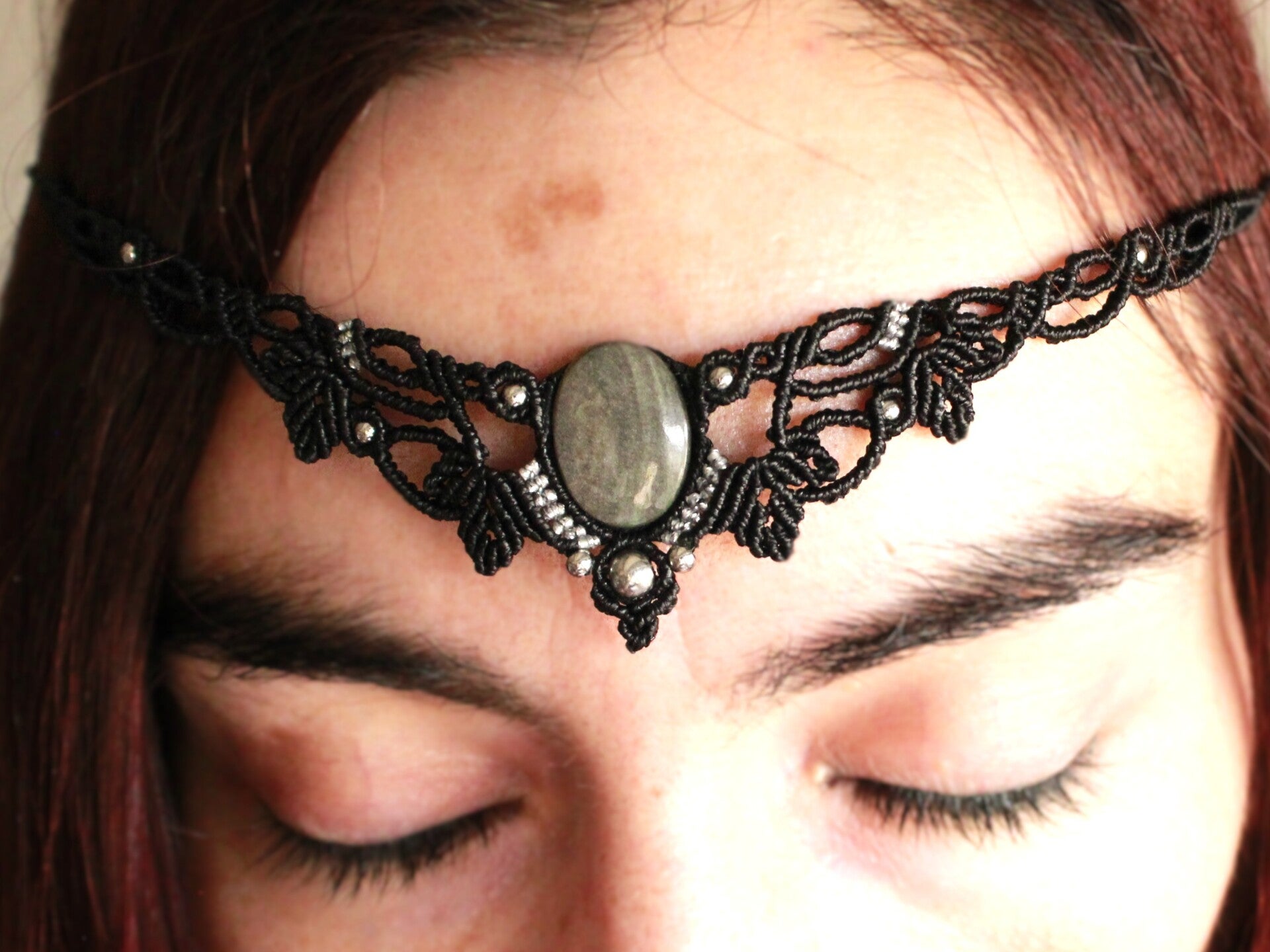 Gargantilla o tiara Garuda con Obsidiana plateada.