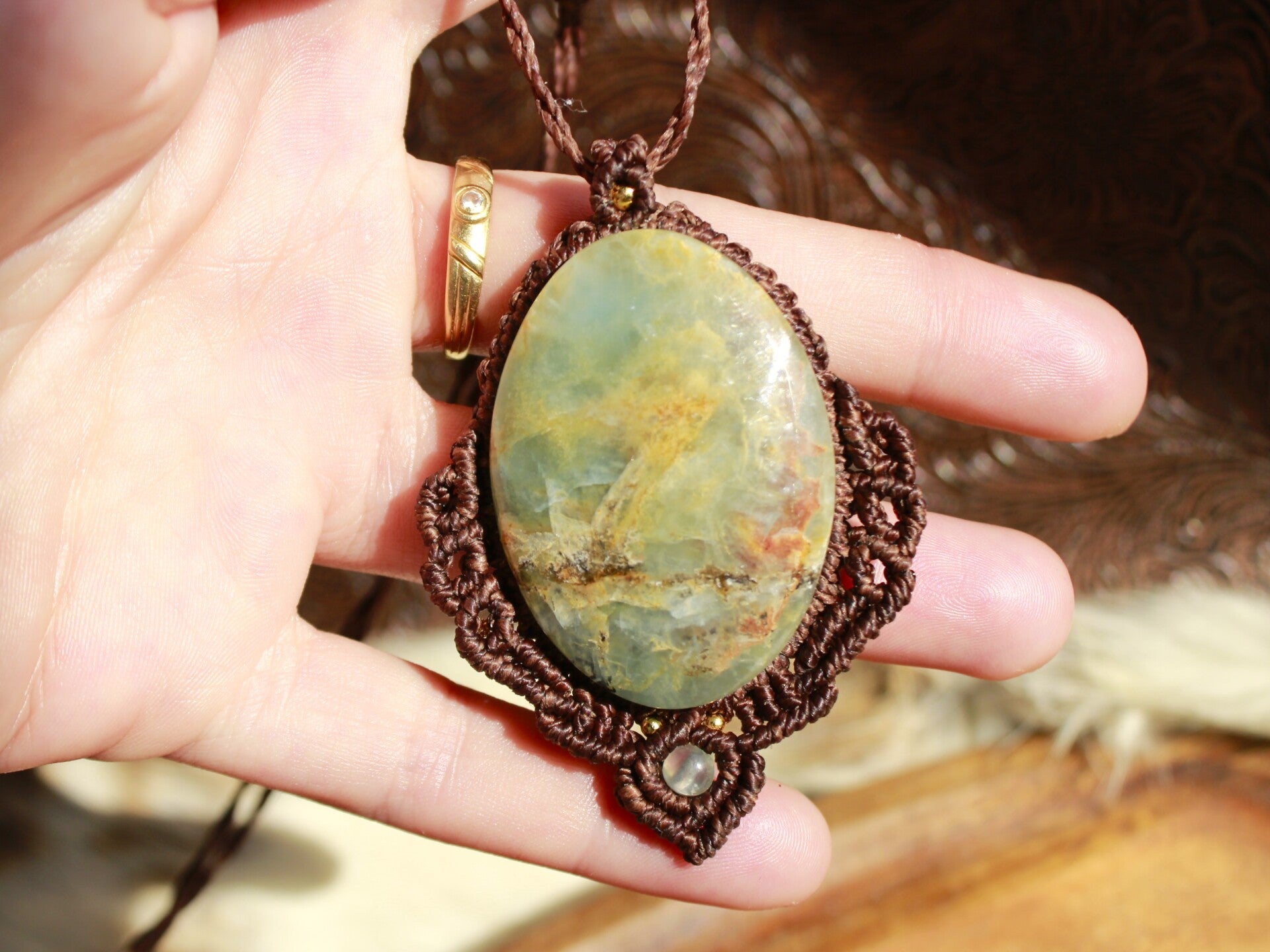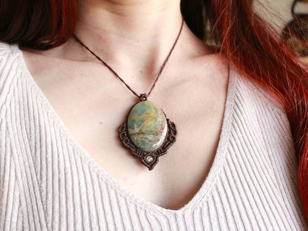 Colgante de macramé con Ónix Cielo grande y cuenta de Prehnita.