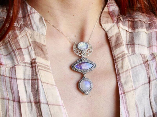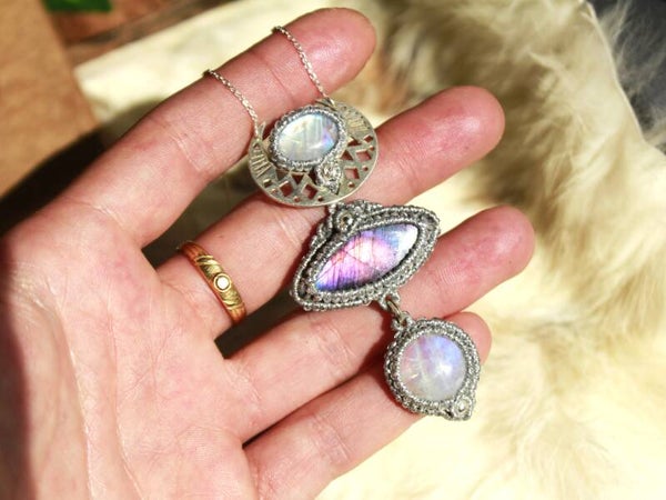 Gargantilla única con dos Piedra Luna arcoíris y Espectrolita multicolor . Plata de Ley.